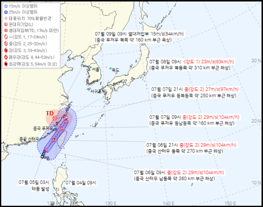기상청에 따르면 7월 5일 새벽 발생한 제4호 태풍 ‘다나스’는 현재 중국 산터우 남동쪽 해상에서 북상 중입니다.